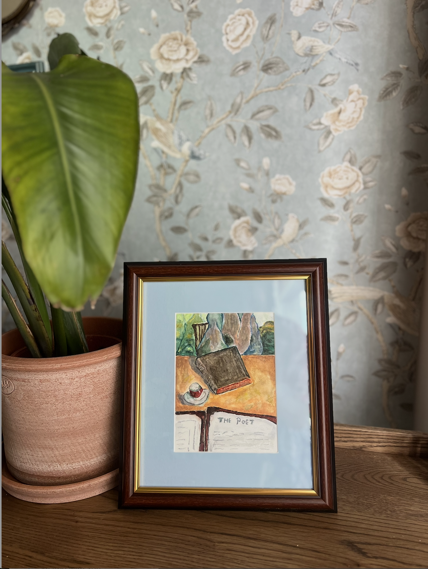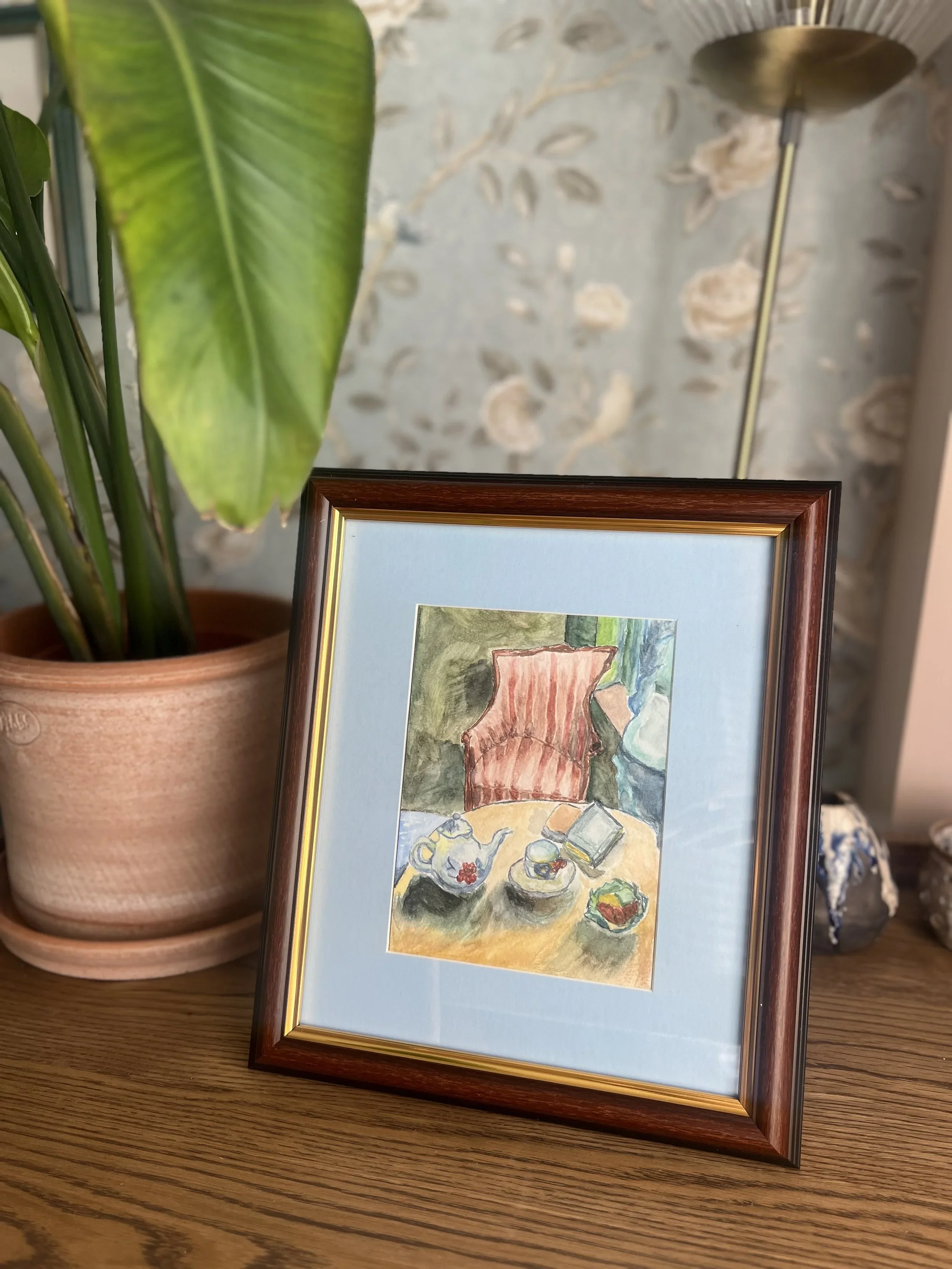 Juliet’s is a lovely, cozy and quaint restaurant, located near where I live in the English countryside, and it’s a restaurant dear to my heart. This painting was inspired by a photo I took on a lovely day, having brunch and some tea at Juliet’s.